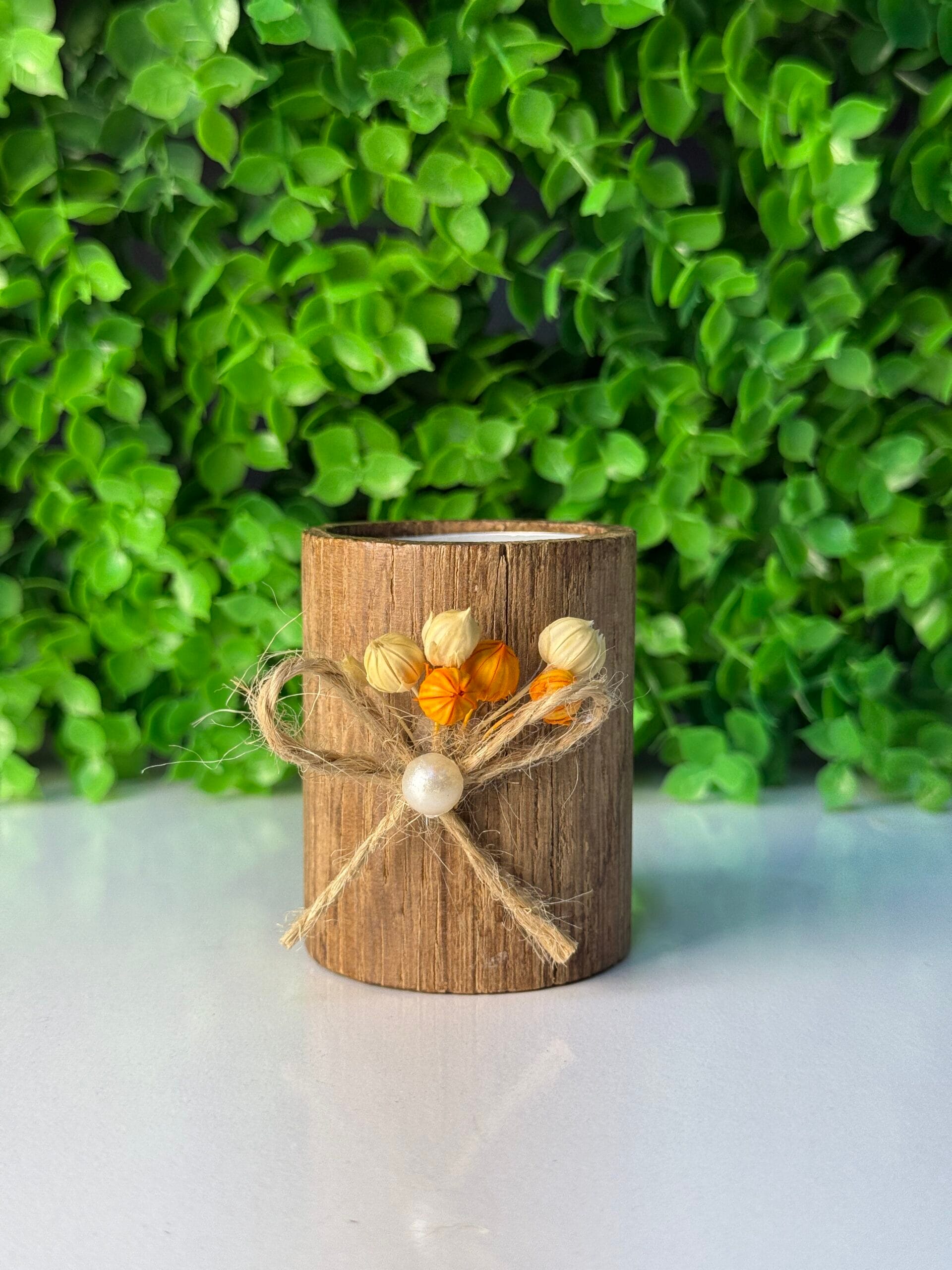 Koyu ahşap dokusunu renkli kuru çiçek tomurcuklarıyla canlandıran, sonbahar esintili doğal mumluk.